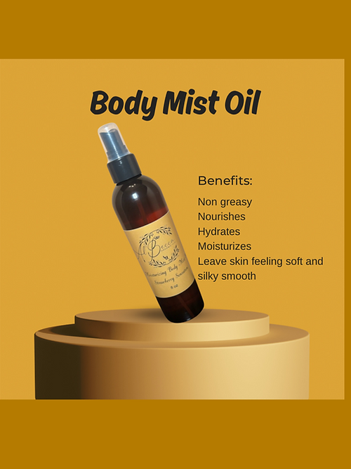 Introducing our luxurious Body Mist Oil - The perfect addition to your bath time routine! Our unique formula ensures that you won't feel too oily or greasy, and won't mess up your sheets. Instead, you'll be left with irresistibly smooth and moisturized skin, and a delicious scent that will leave you feeling refreshed and revived. Simply spray on after your bath or shower for a light, silky smooth finish. Choose from our range of amazing scents and elevate your self-care routine to the next level!