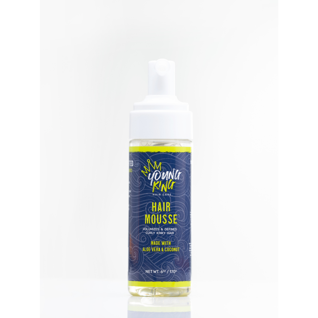 Young King Hair Mousse volumizes + defines kinky curls, while keeping strands flexibly soft.